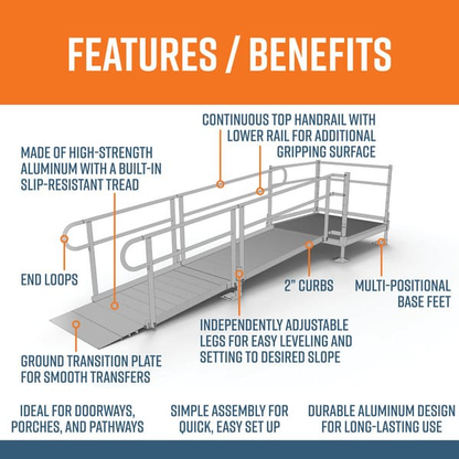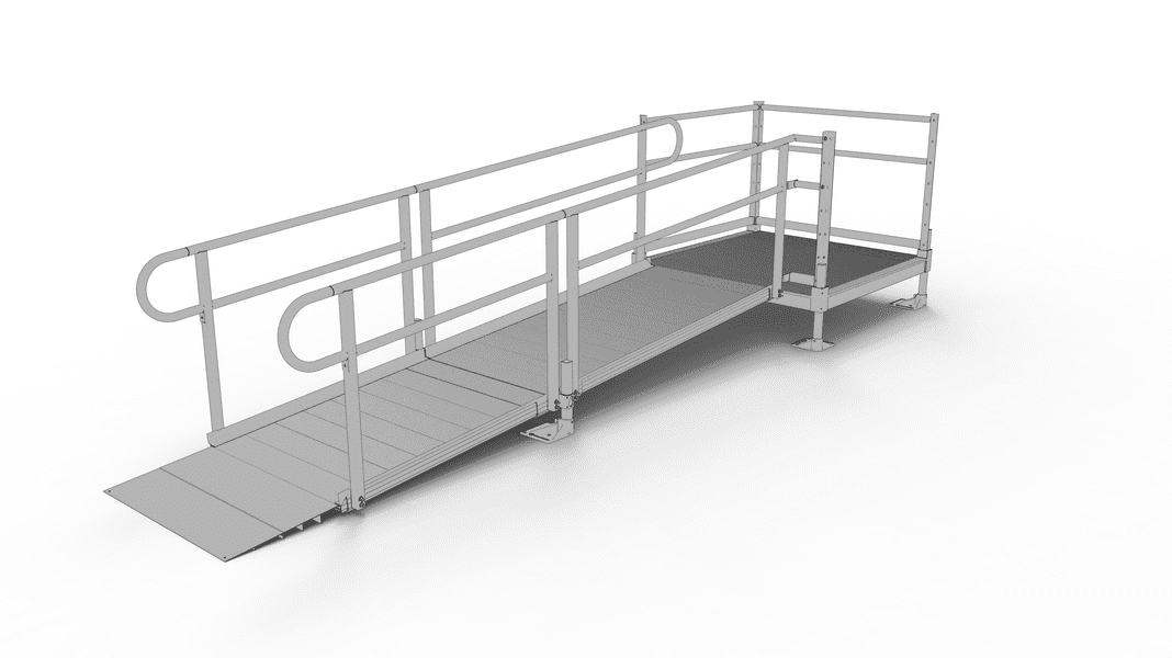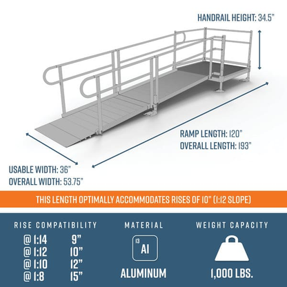 PATHWAY 3G Kit de rampa recta de aluminio para silla de ruedas de 10 pies con banda de rodadura de superficie sólida, pasamanos de 2 líneas y plataforma superior de 4 pies