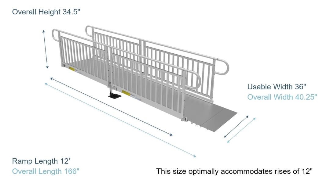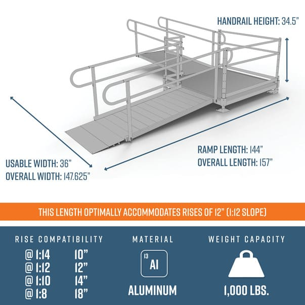 PATHWAY 3G Kit de rampa para silla de ruedas de aluminio en forma de L de 12 pies con banda de rodadura de superficie sólida, pasamanos de estacas verticales y plataforma giratoria de 5 pies