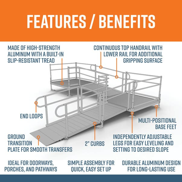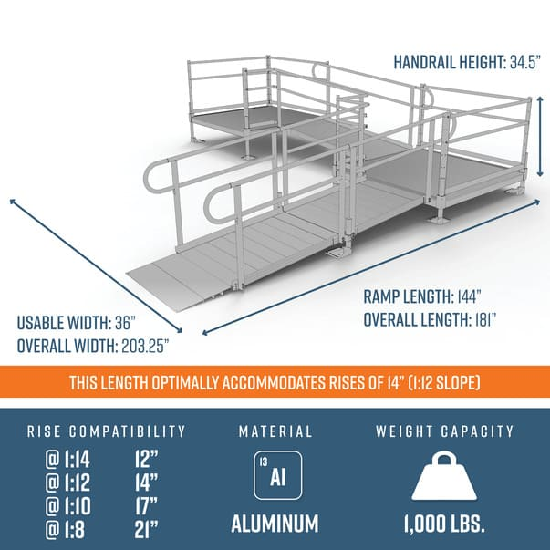 PATHWAY 3G Kit de rampa para silla de ruedas de aluminio en forma de L de 14 pies con banda de rodadura de metal expandido, pasamanos de 2 líneas, plataforma giratoria de 5 pies y plataforma superior de 5 pies