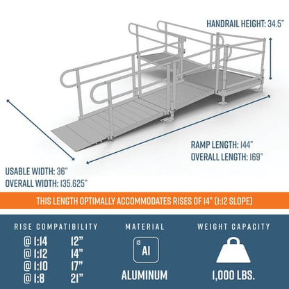 PATHWAY 3G Kit de rampa para silla de ruedas de aluminio en forma de L de 14 pies con banda de rodadura de superficie sólida, pasamanos de estacas verticales y plataforma giratoria de 4 pies