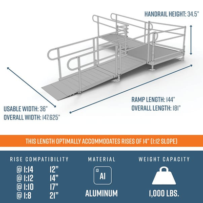 PATHWAY 3G Kit de rampa para silla de ruedas de aluminio en forma de L de 14 pies con banda de rodadura de superficie sólida, pasamanos de estacas verticales y plataforma giratoria de 5 pies