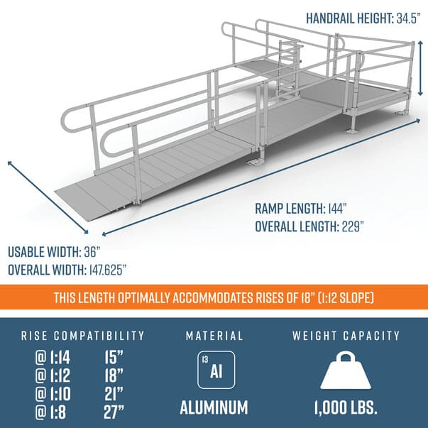 This 18’ ramp kit includes one 5' x 5' turn platform (can be configured for left or right turn), three 6' ramps, handrails, and all other necessary components.
