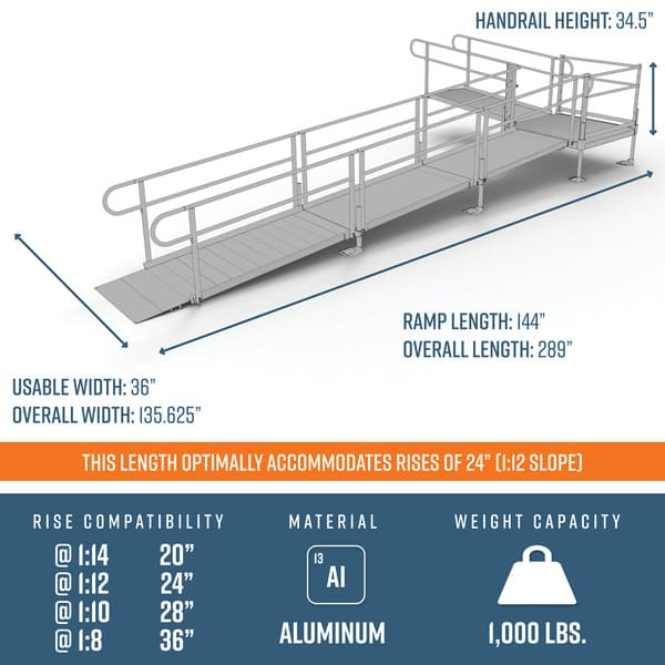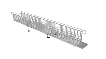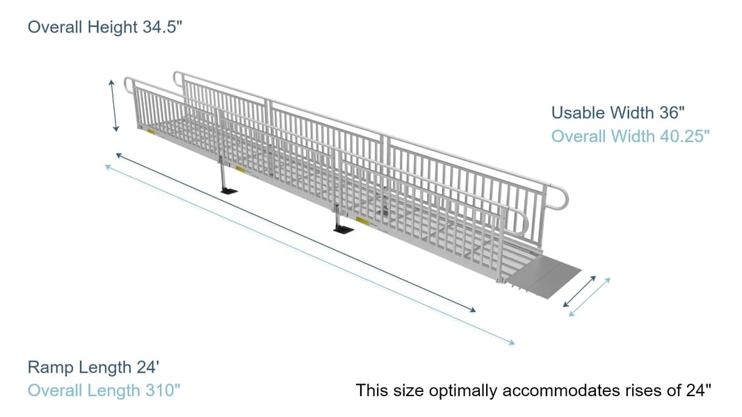 PATHWAY 3G Kit de rampa para silla de ruedas de aluminio en forma de L de 24 pies con banda de rodadura de metal expandido, pasamanos verticales y plataforma giratoria de 4 pies