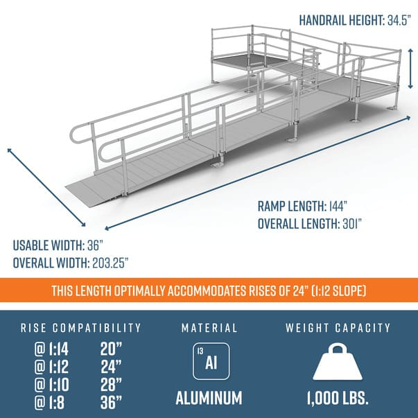 PATHWAY 3G Kit de rampa para silla de ruedas de aluminio en forma de L de 24 pies con banda de rodadura de superficie sólida, pasamanos de estacas verticales, plataforma giratoria de 5 pies y plataforma superior de 5 pies