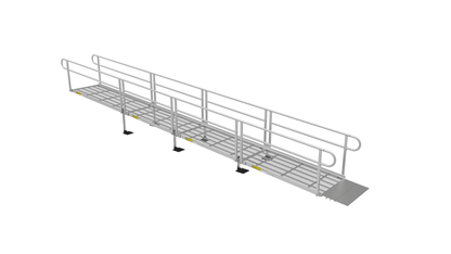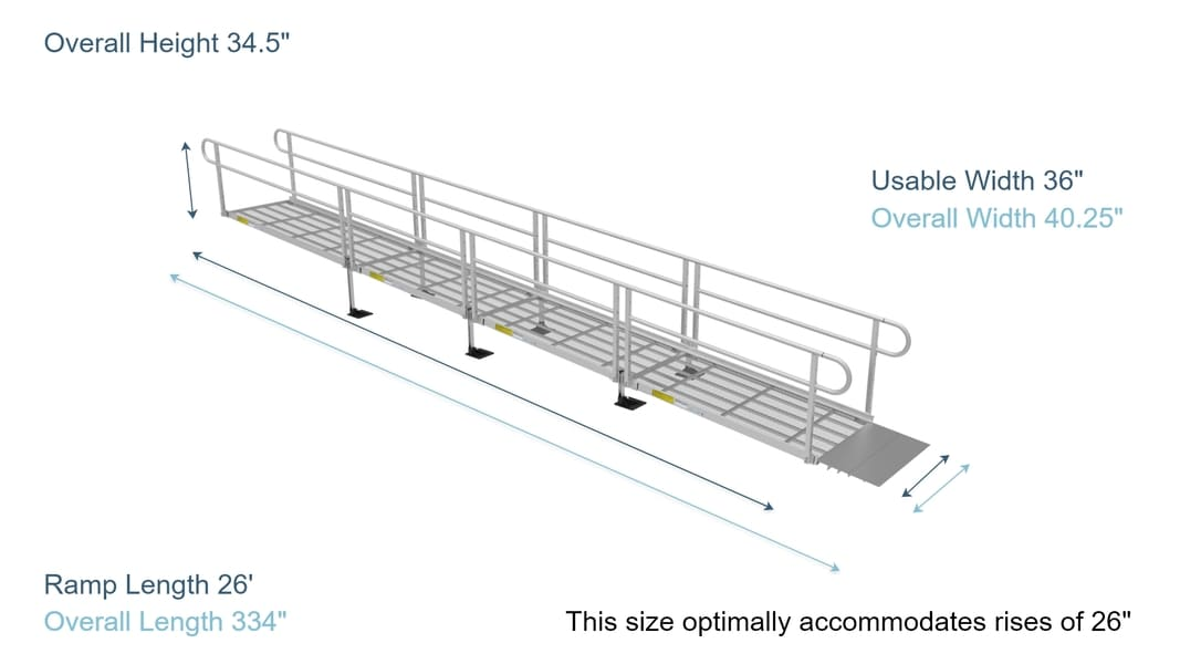 PATHWAY 3G Kit de rampa para silla de ruedas de aluminio en forma de L de 26 pies con banda de rodadura de metal expandido, pasamanos de 2 líneas y plataforma giratoria de 4 pies