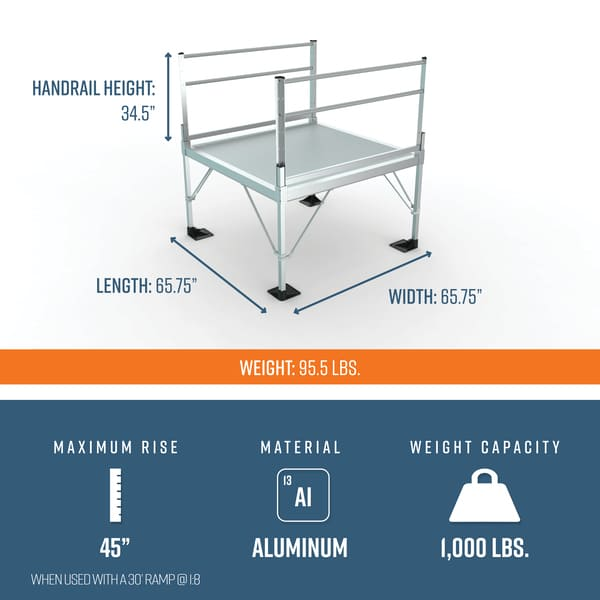 This 28’ ramp kit includes one 5' x 5' turn platform (can be configured for left or right turn), four 6' ramps, one 4’ ramp, handrails, and all other necessary components.