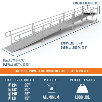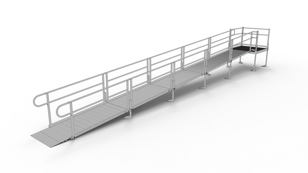 PATHWAY 3G Kit de rampa recta de aluminio para silla de ruedas de 30 pies con banda de rodadura de superficie sólida, pasamanos de 2 líneas y plataforma superior de 4 pies
