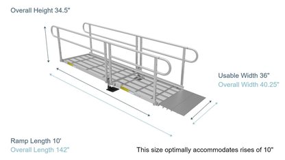 This 10’ ramp kit includes one 4' x 4' turn platform (can be configured for left or right turn), one 6' ramp, one 4’ ramp, handrails, and all other necessary components.