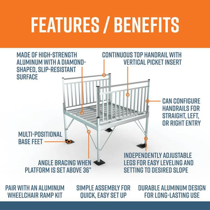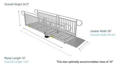 This 10’ ramp kit includes one 5' x 5' top platform (can be configured for straight, left, or right entry), one 5’ x 5’ turn platform, one 6' ramp, one 4’ ramp, handrails, and all other necessary components.