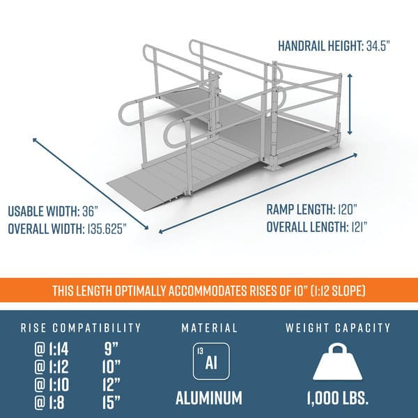 PATHWAY 3G 10 ft. L-Shaped Aluminum Wheelchair Ramp Kit with Solid Surface Tread, 2-Line Handrails and 4 ft. Turn Platform