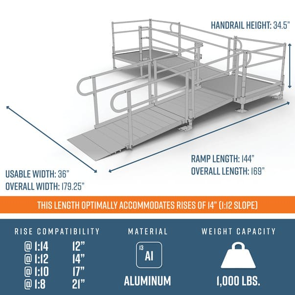 This 14’ ramp kit includes one 4' x 4' top platform (can be configured for straight, left, or right entry), one 4’ x 4’ turn platform, one 6' ramp, two 4’ ramps, handrails, and all other necessary components.