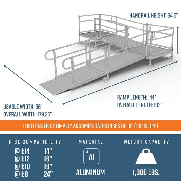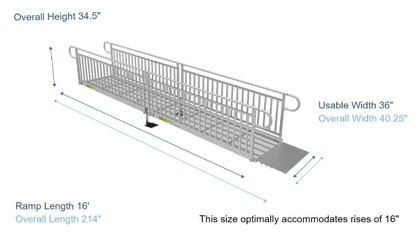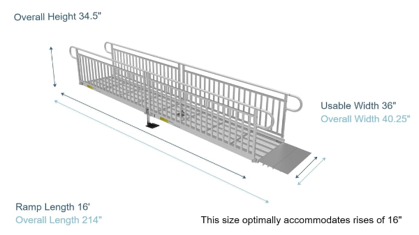 This 16’ ramp kit includes one 4' x 4' top platform (can be configured for straight, left, or right entry), one 4’ x 4’ turn platform, two 6' ramps, one 4’ ramp, handrails, and all other necessary components.