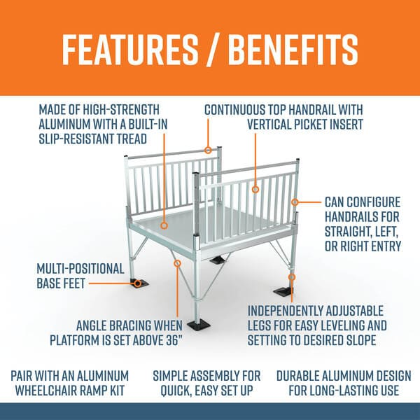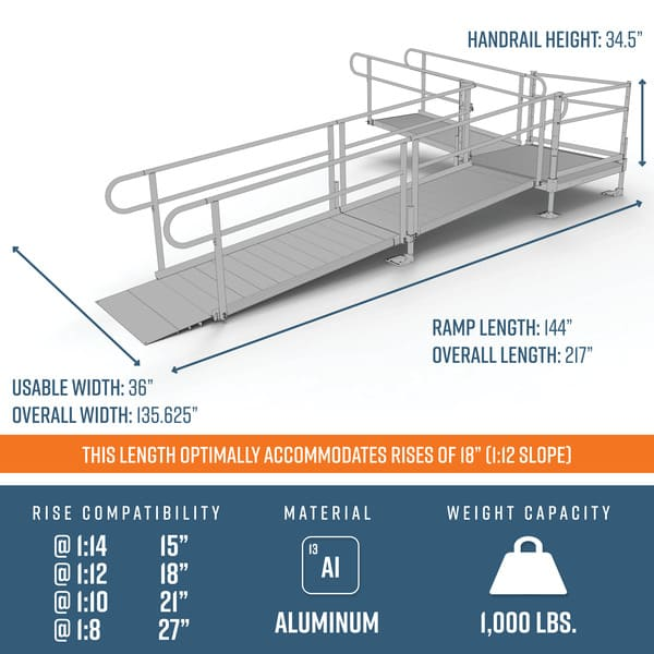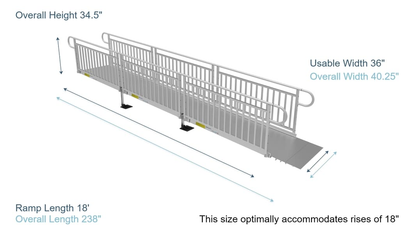 This 18’ ramp kit includes one 4' x 4' turn platform (can be configured for left or right turn), three 6' ramps, handrails, and all other necessary components.