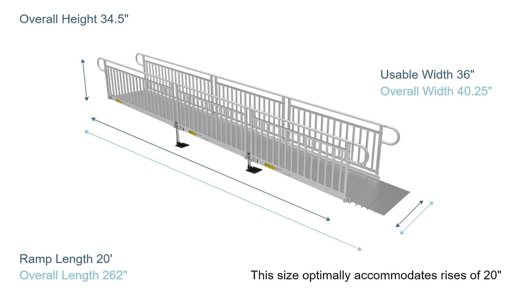 This 20’ ramp kit includes one 5' x 5' top platform (can be configured for straight, left, or right entry), two 6' ramps, two 4’ ramps, handrails, and all other necessary components.