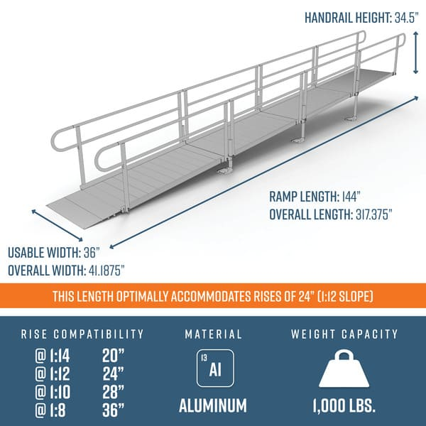 This 24’ ramp kit includes one 5' x 5' top platform (can be configured for straight, left, or right entry), one 5’ x 5’ turn platform, four 6' ramps, handrails, and all other necessary components.