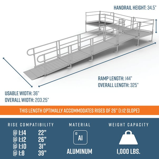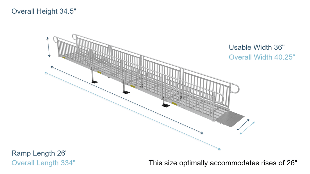 This 26’ ramp kit includes one 5' x 5' top platform (can be configured for straight, left, or right entry), one 5’ x 5’ turn platform, three 6' ramps, two 4’ ramps, handrails, and all other necessary components.