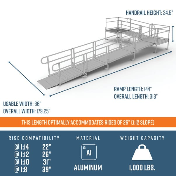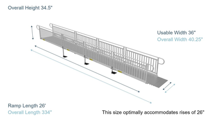 This 26’ ramp kit includes one 4' x 4' top platform (can be configured for straight, left, or right entry), one 4’ x 4’ turn platform, three 6' ramps, two 4’ ramps, handrails, and all other necessary components.