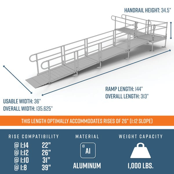 This 26’ ramp kit includes one 4' x 4' turn platform (can be configured for left or right turn), three 6' ramps, two 4’ ramps, handrails, and all other necessary components.