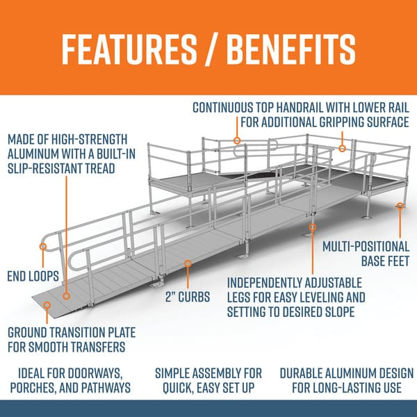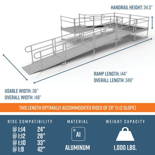 This 28’ ramp kit includes one 5' x 5' top platform (can be configured for straight, left, or right entry), two 5’ x 5’ turn platforms, four 6' ramps, one 4’ ramp, handrails, and all other necessary components.