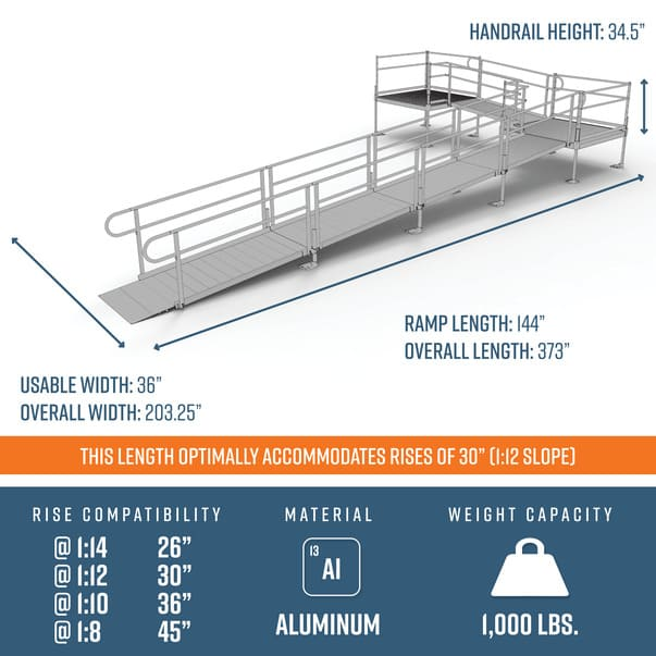 This 30’ ramp kit includes one 5' x 5' top platform (can be configured for straight, left, or right entry), one 5’ x 5’ turn platform, five 6' ramps, handrails, and all other necessary components.