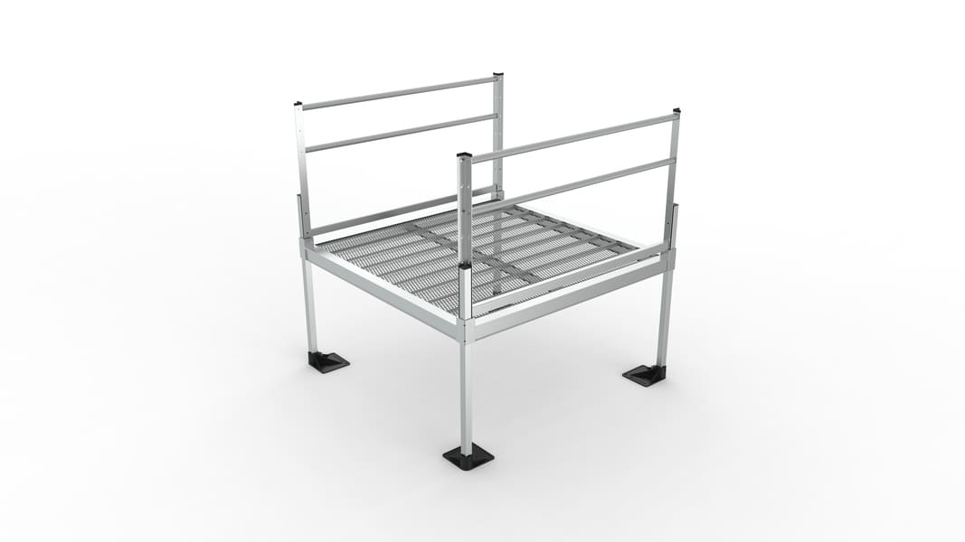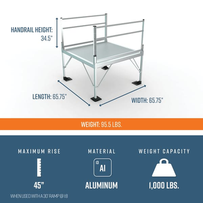 This 30’ ramp kit includes one 5' x 5' top platform (can be configured for straight, left, or right entry), five 6' ramps, handrails, and all other necessary components.